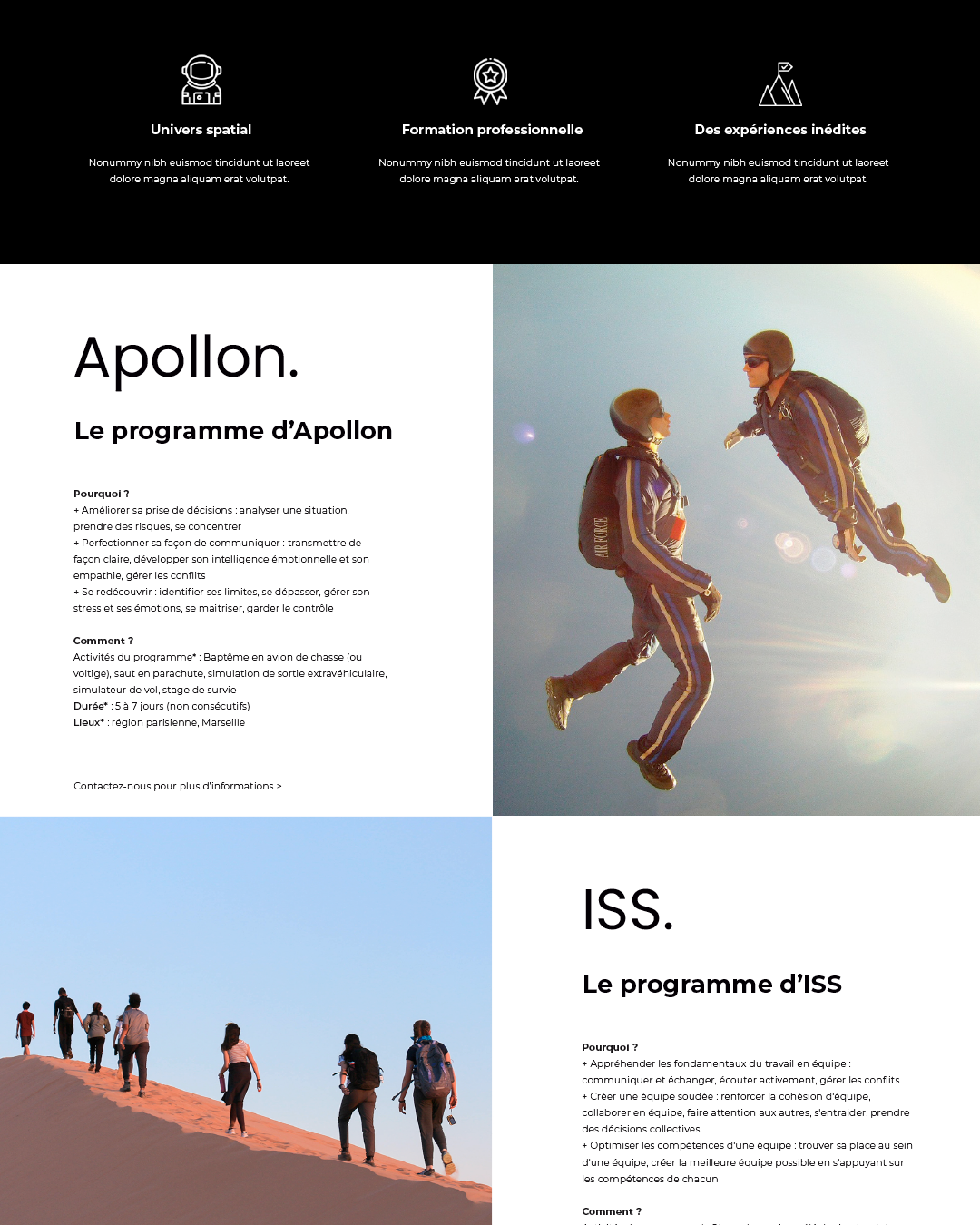 L’approche artistique est conçue pour répondre à la spécificité du projet : sortir de sa zone de confort et renforcer ses compétences et ses qualités humaines, à travers de nouvelles expériences. Pour ce faire, plusieurs mots-clés ont été au cœur de l’identité visuelle : l’univers spatial, la formation, les astronautes, l’expérience et l’aventure. Le résultat est un univers graphique très simple et épuré. Le noir et le blanc jouent ensemble pour créer un dynamisme et un professionnalisme qui s’épanouiront dans le temps. La mise en page est construite sur une base géométrique complète. Quant au logo, il correspond à la formation professionnelle et au monde de l’espace.